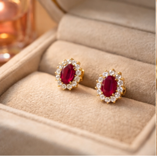 Aretes elaborados en oro amarillo, con un rubí ovalado como gema central, rodeado por un fino halo de diamantes que aporta luminosidad y realza el color profundo de la piedra.